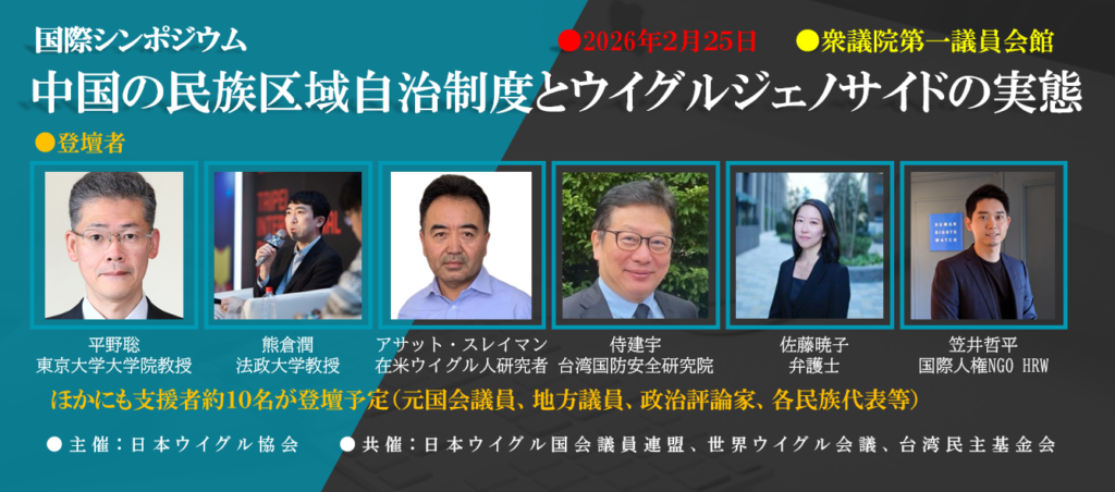 この度、日本ウイグル協会は、日本ウイグル国会議員連盟、世界ウイグル会議、台湾民主基金会などと協力し、日本、米国、台湾の学者、人権とビジネスの専門家らを日本の国会に集め、下記の通り国際シンポジウムを開催します。皆様のご参加をお待ちしております。