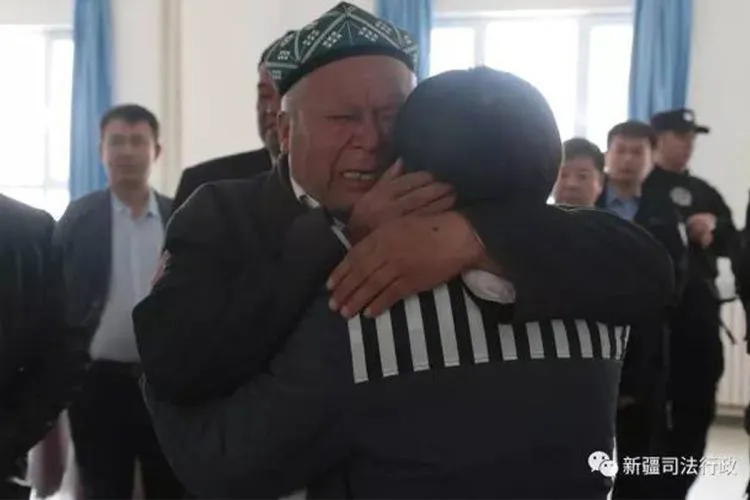ウイグル人の父親が息子に「思想犯罪」を告白し、寛大な処置を受けるために中国共産党に従うよう告げる場面(日本ウイグル協会提供)